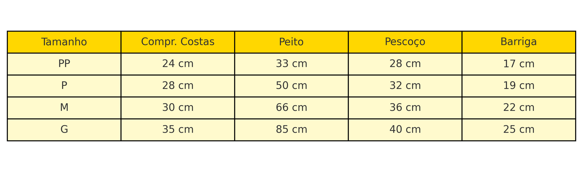 Consulte a tabela de medidas para escolher o tamanho ideal para seu pet. Em caso de dúvida, recomendamos optar por um tamanho maior para maior conforto.