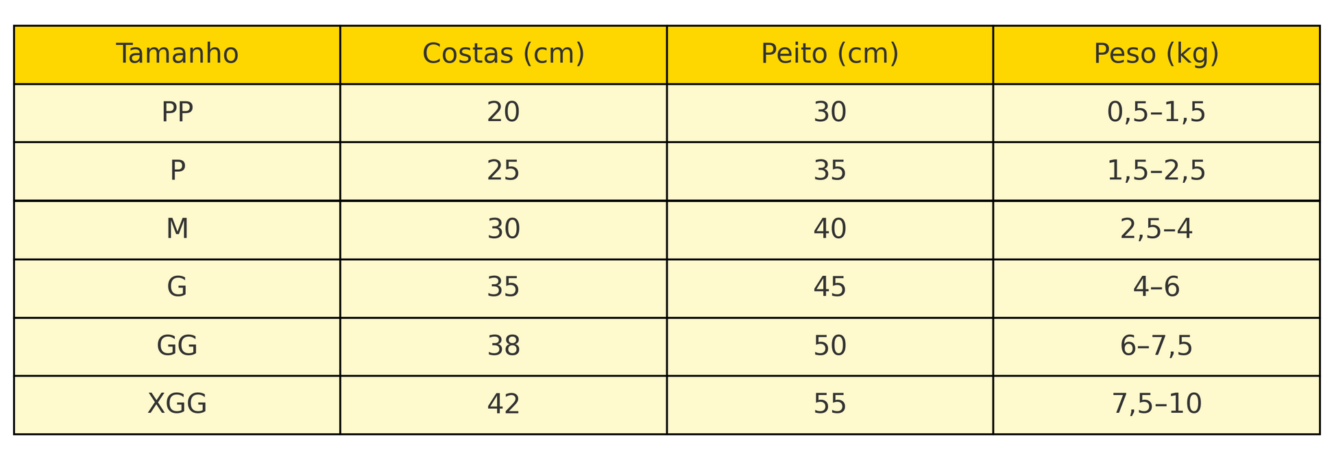 Dica: Sempre verifique as medidas do seu pet antes de escolher o tamanho correto.