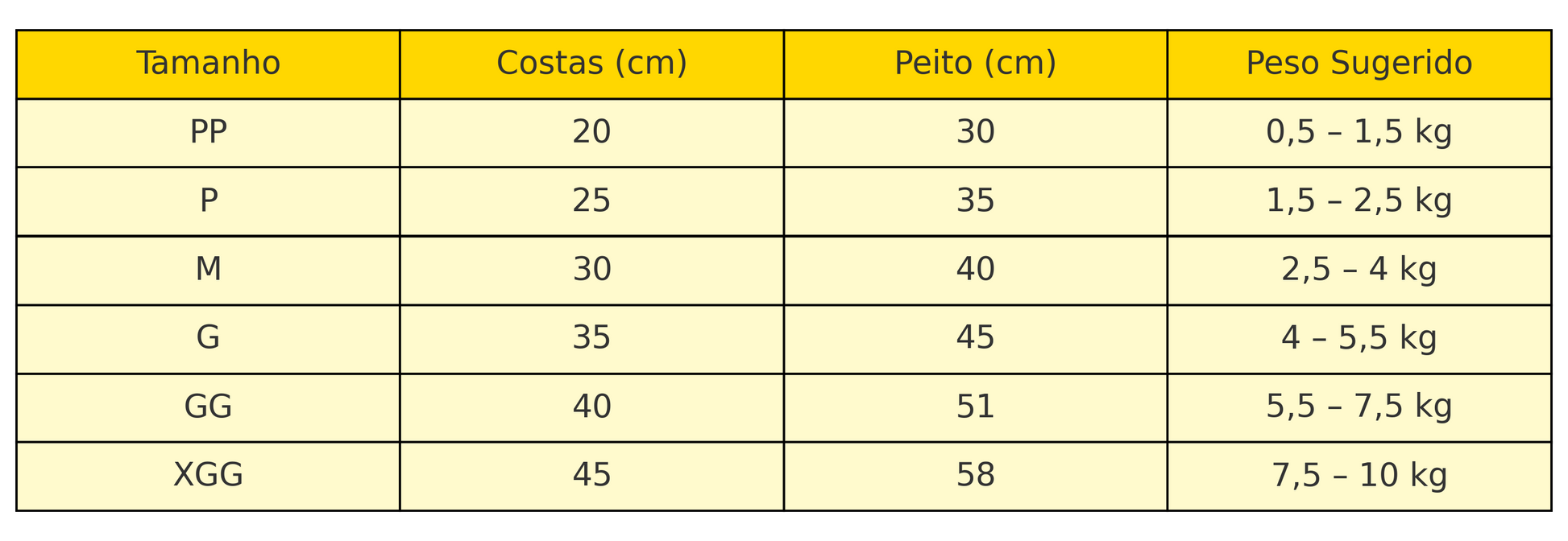 Meça seu pet antes da compra! Use uma fita métrica para medir o comprimento do dorso, o tórax e o pescoço do seu pet. Se ele estiver entre dois tamanhos ou for filhote, escolha o tamanho maior para garantir conforto.