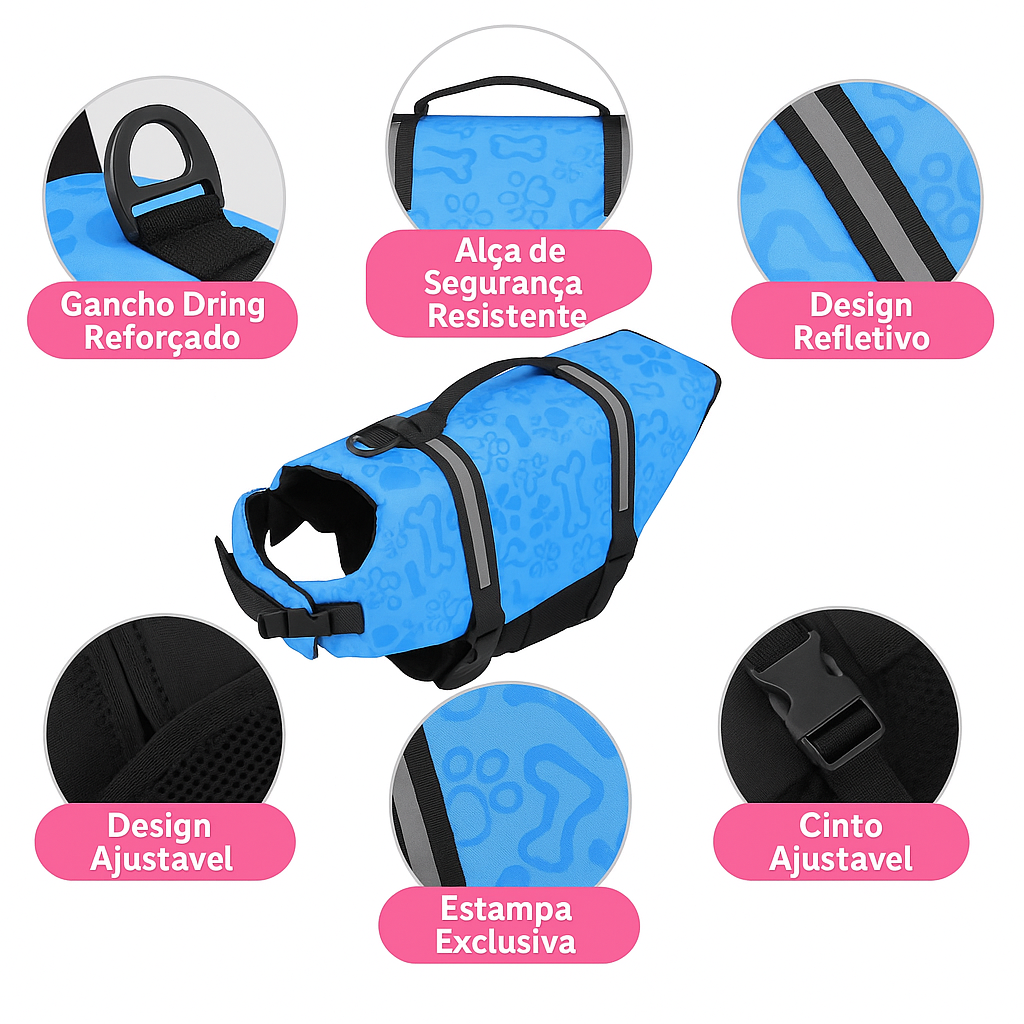 - Alta Visibilidade: Cores vibrantes e tiras refletivas facilitam encontrar seu pet na água ou à noite.