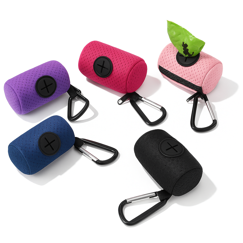 Disponível em várias cores modernas — preto, azul, rosa, roxo, branco e rosa vermelha —, o dispensador é feito em tecido de malha sanduíche, garantindo resistência e durabilidade. Seu design conta com ganchos para fácil transporte, podendo ser pendurado na coleira, bolsa ou cinto, mantendo tudo sempre à mão.