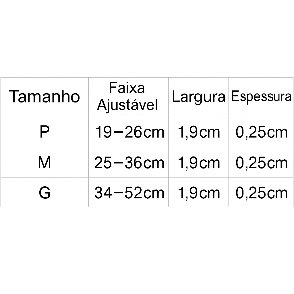 - Tamanhos disponíveis: P, M e G, com larguras ajustadas para diferentes portes.