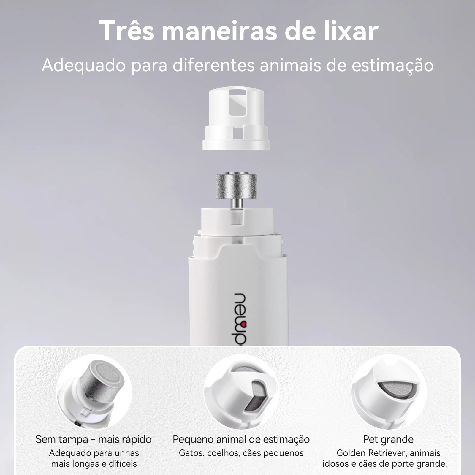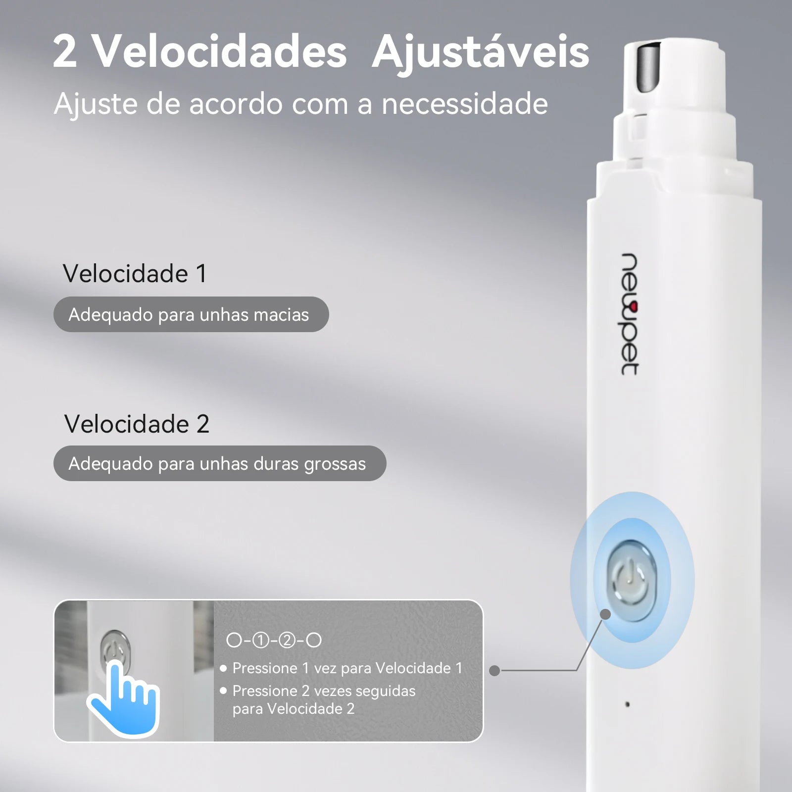 - Modos de velocidade versáteis: ajustáveis para diferentes tamanhos de unhas, garantindo um cuidado personalizado para seu pet.
