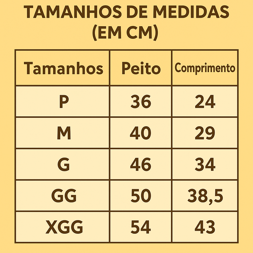 - Roupa de 4 patas considera o comprimento total do dorso.